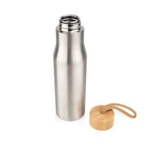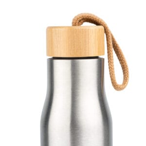 Botella de acero inoxidable de 500 ml (17 oz) con tapa de rosca hecha de bambú y cordón para un transporte sencillo. Un diseño simple pero encantador.