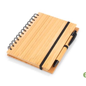 Cuaderno argollado “doble O” con Cubierta y bolígrafo en Bambú. 70 hojas rayadas en papel reciclado. Banda porta bolígrafo. Tamaño aproximado A5.