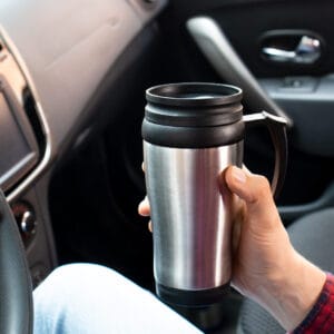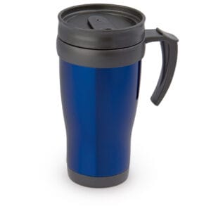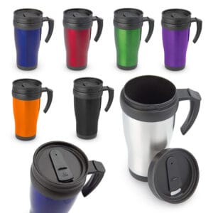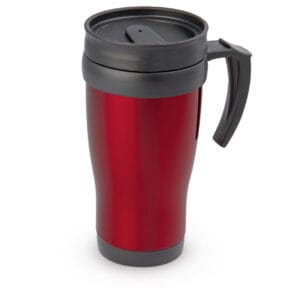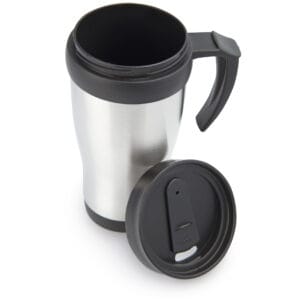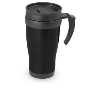 Mug viajero doble pared con recubrimiento interior plástico, que permite la conservación de la temperatura de acuerdo al ambiente. Con agarradera y tapa corrediza para fácil transporte. Capacidad: 450 ml / 15 Oz.