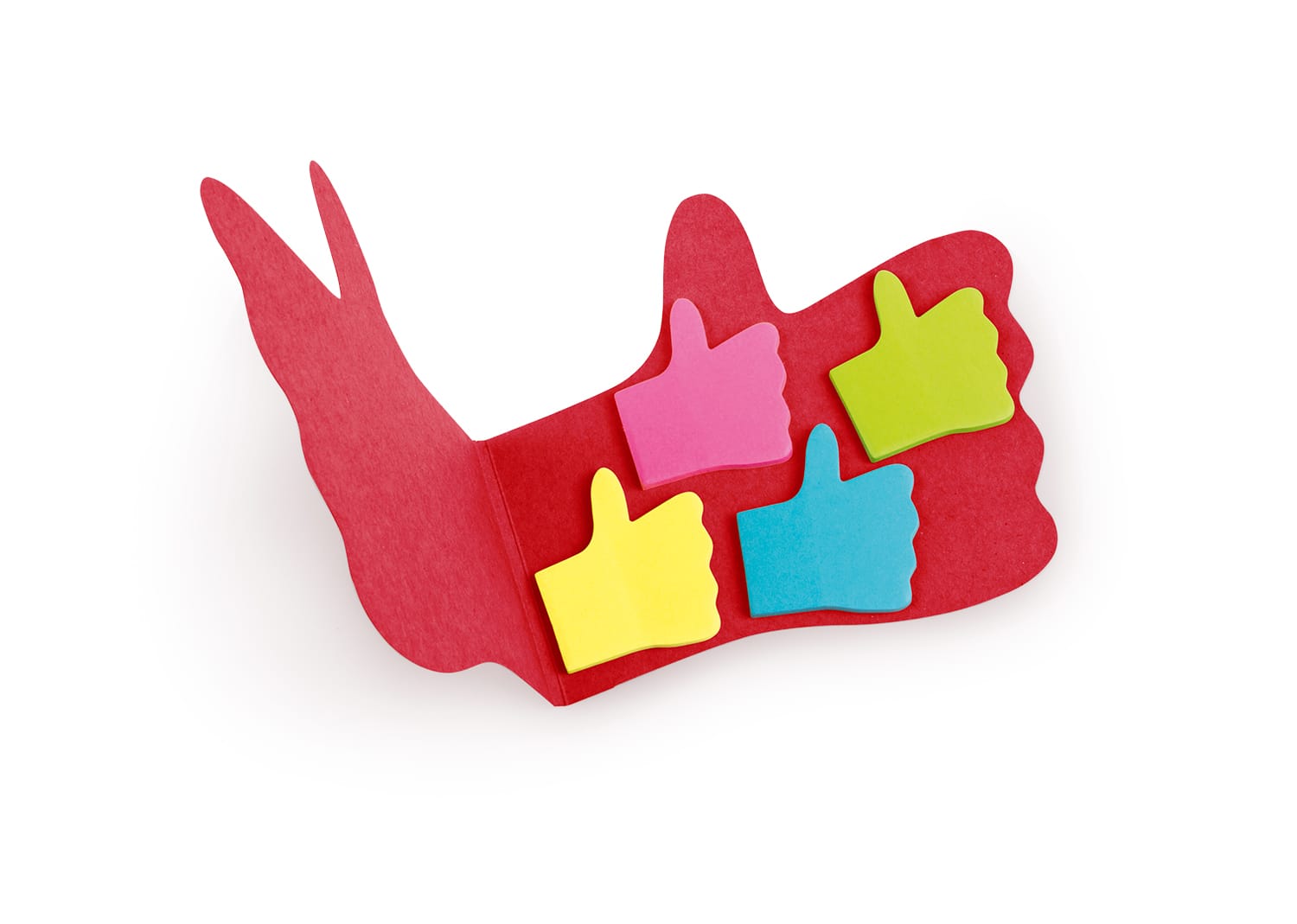 Memo con cubierta en forma de mano con pulgar arriba. 25 notas adhesivas por color (4 colores).