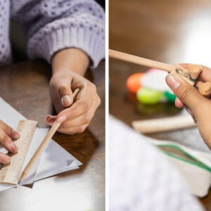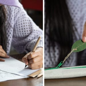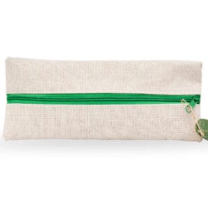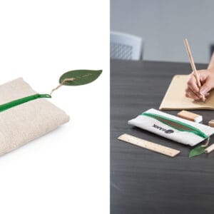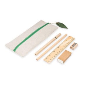 Cartuchera escolar de diseño fresco y natural que incluye: lápiz, bolígrafo, borrador, sacapuntas y regla de 15 cm.