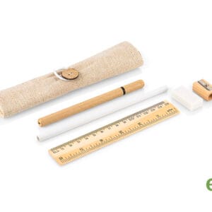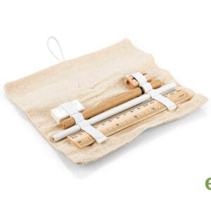 Material: Estuche en Algodón / Lápiz, Regla y Sacapuntas en Madera / Bolígrafo en Papel Reciclado