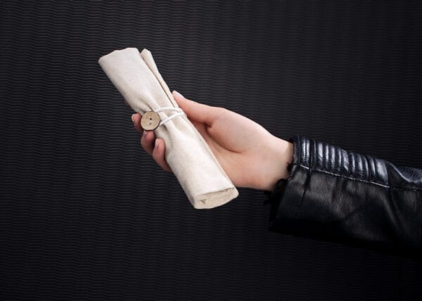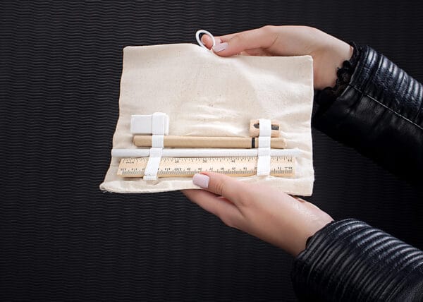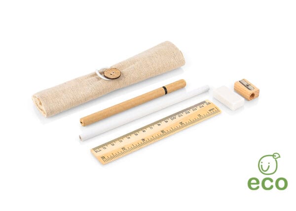 Material: Estuche en Algodón / Lápiz, Regla y Sacapuntas en Madera / Bolígrafo en Papel Reciclado