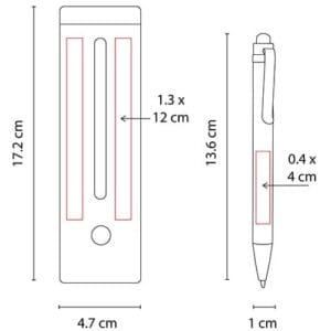 Área de Impresión: 0.4 x 4 cm Bolígrafo / 1.3 x 12 cm Estuche