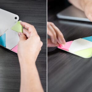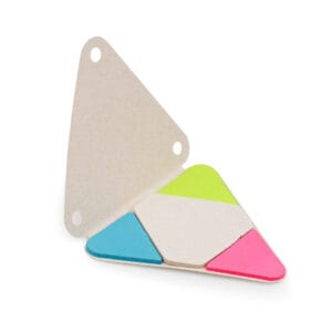 Set de memos elaborados en material recuperado de cajas Tetra Pak. Incluye 3 juegos de banderas adhesivas en papel de colores de 20 hojas cada uno.