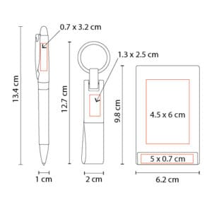 Área de Impresión: 1.3 x 2.5 cm Llavero / 0.7 x 3.2 cm Bolígrafo / 5 x 0.7 cm Tarjetero