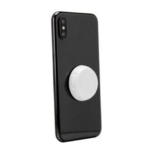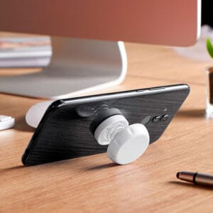 Soporte desplegable con adhesivo al reverso para pegarse al smartphone.