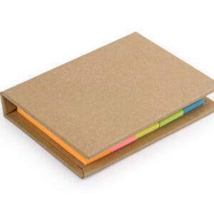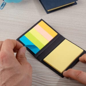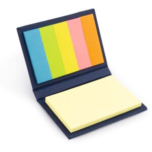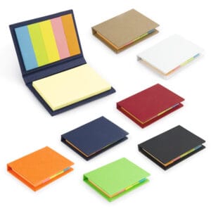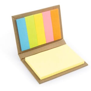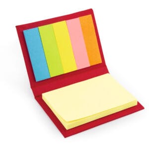 Set con taco de memos amarillos de 50 hojas y 5 tacos de banderas adhesivas en papel de colores de 25 hojas c/u. Tapa dura. Tamaño aproximado de las hojas: A8.