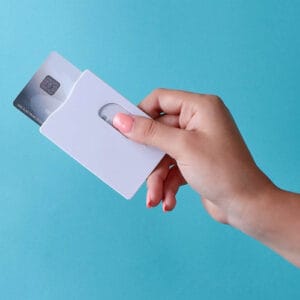 Tarjetero vertical. Espacio para una tarjeta. Desplazar la tarjeta para su uso. Material antimicrobiano. Sistema anti robo RFID.