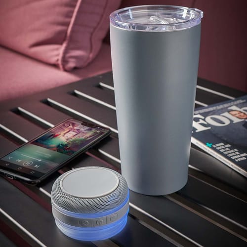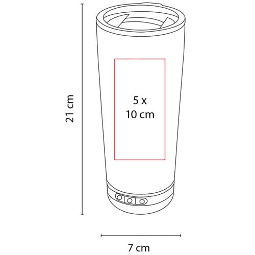 Doble pared. Cerrado al vacío. Pared interna y externa acero inoxidable. Tapa de plástico con válvula de seguridad. Mantiene temperatura caliente 6 hrs y temperatura fría 8 hrs aproximadamente. Incluye bocina bluetooth, controles de volumen y reproducción de audio, cable USB y batería recargable. Bocina removible con efecto de luces. Caja individual incluida.
