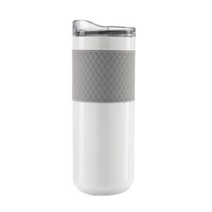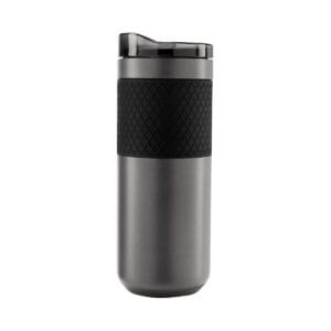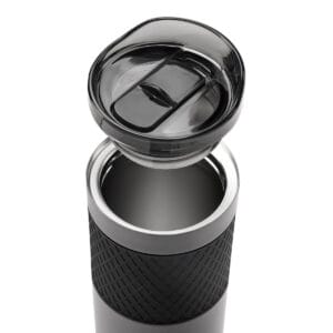 Doble pared. Cerrado al vacío. Pared interna y externa de acero inoxidable. Incluye tapa de plástico con cierre de rosca y válvula de seguridad. Banda de silicón texturizada antideslizante. Mantiene temperatura caliente 6 hrs y temperatura fría 8 hrs. Incluye caja individual.
