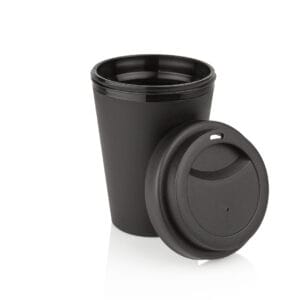 Vaso para café elaborado en PLA con tapa roscada. Tiene una capacidad de 450 ml y no debe utilizarse con líquidos que superen los 50℃, ya que esta es la temperatura máxima que el producto puede soportar. El PLA es un material biodegradable y compostable, lo que lo convierte en una excelente opción para empresas comprometidas con el cuidado del medioambiente.