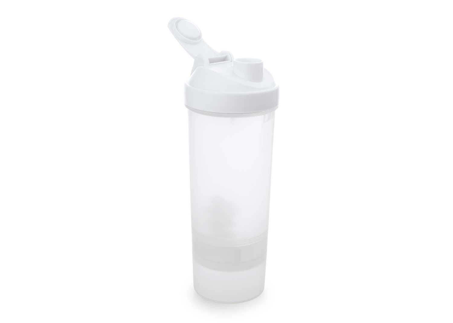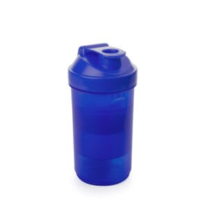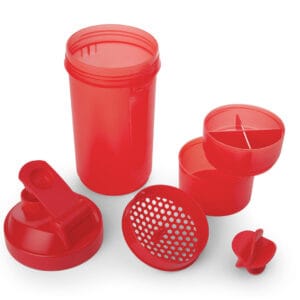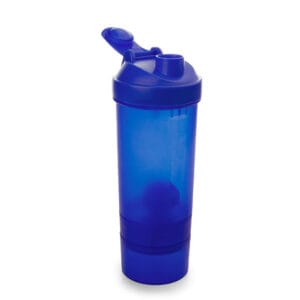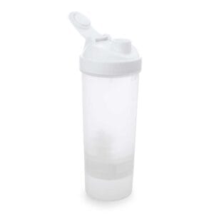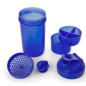 Botella con Shaker, colador, vaso y pastillero con compartimientos removibles. En PP, Libre de BPA, ftalatos u otras sustancias nocivas. No retiene ni transmite sabores u olores. Capacidad 500ml / 17 oz .