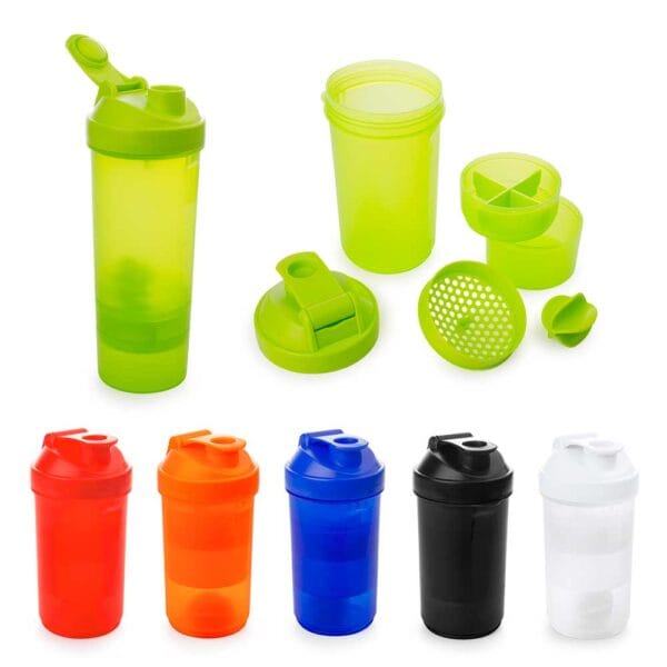 Botella con Shaker, colador, vaso y pastillero con compartimientos removibles. En PP, Libre de BPA, ftalatos u otras sustancias nocivas. No retiene ni transmite sabores u olores. Capacidad 500ml / 17 oz .