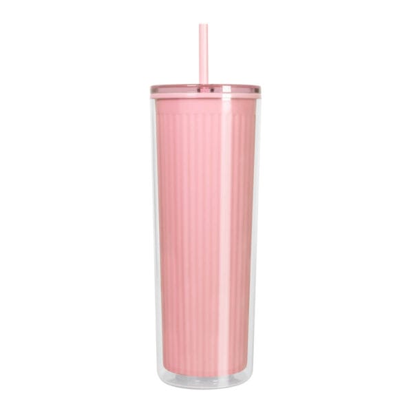 Termo de plástico doble pared. Pared interna de color, texturizada a rayas, y pared externa lisa y transparente que, en conjunto, ofrecen un diseño moderno y vibrante. Incluye tapa de plástico con sistema push y popote a juego. Capacidad de 22 Oz. Base de 7.5 cm de diámetro. Incluye caja individual.